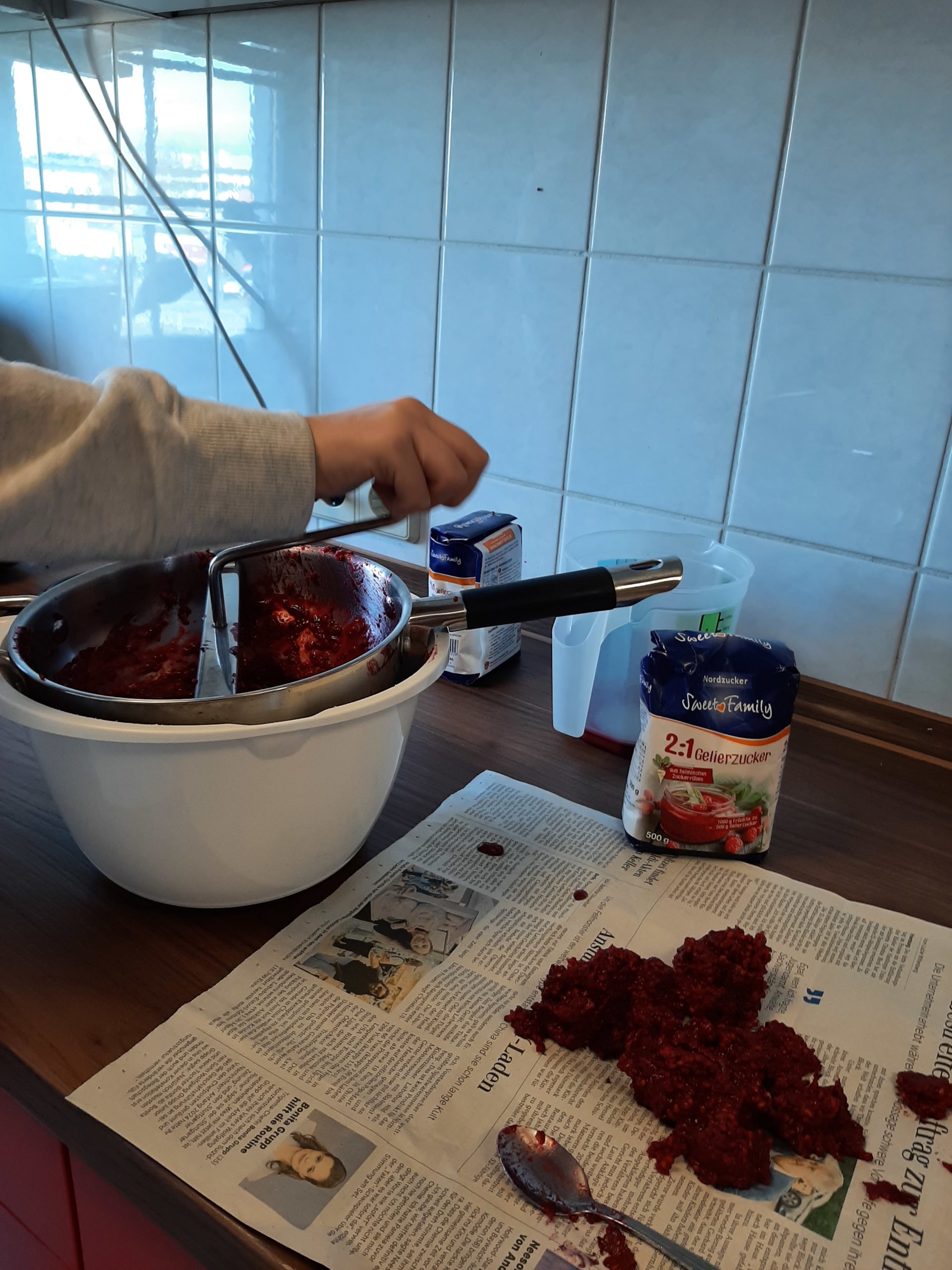 Unser diesjähriges Johannisbeergelee ist großartig gelungen! In diesem Jahr hatten wir zirka zwei Kilogramm Johannisbeeren geerntet. Daya rührte die Früchte und halb beim Abfüllen. Außerdem hatte sie zuvor die Zutaten zusammengesucht und die nötigen Arbeitsmaterialien bereitgestellt.