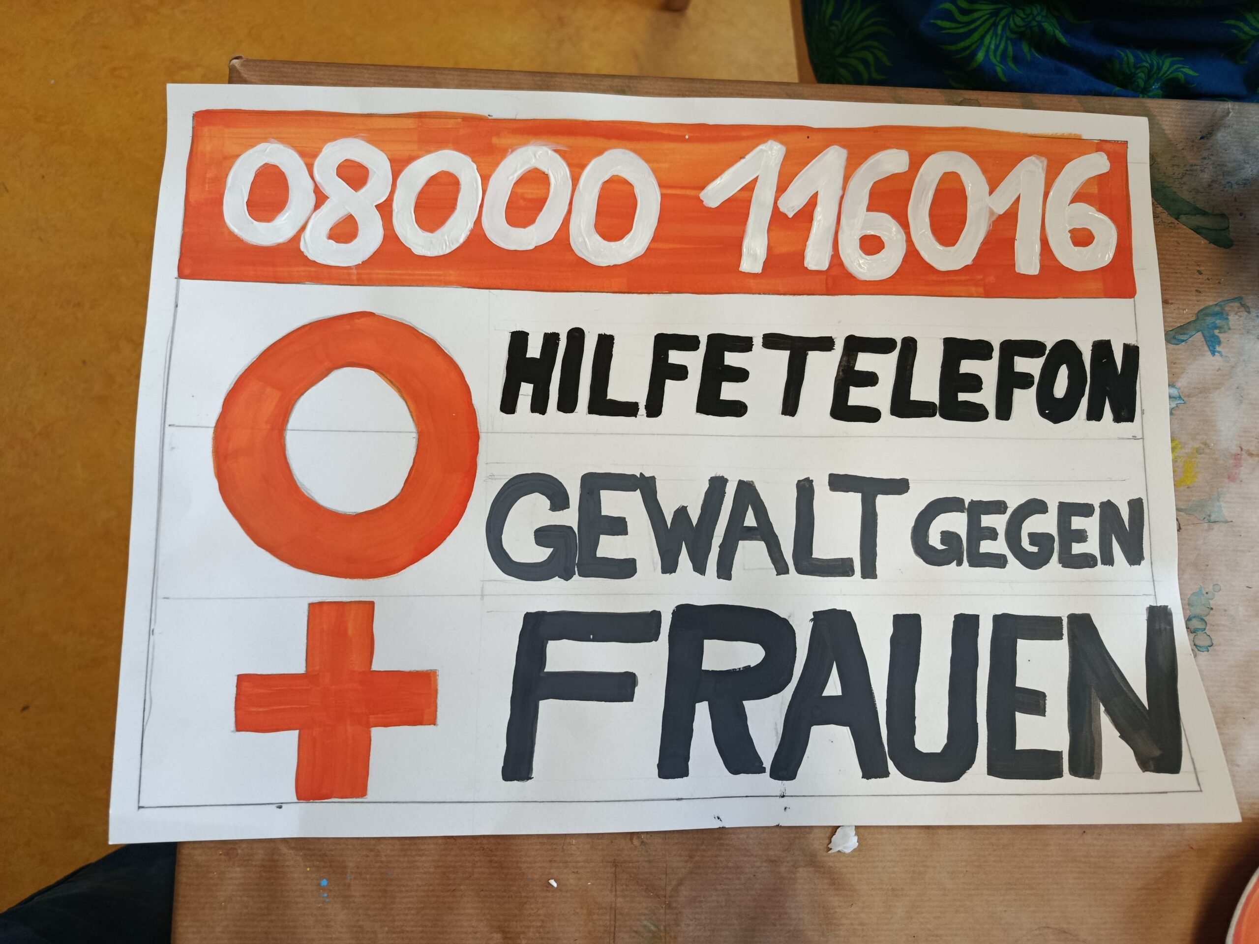 Wir Frauenbeauftragten sind gerade dabei, das Event One Billion Rising vorzubereiten. Vielerorts soll unser gemeinsamer Tanz Frauen stärken und auf gegen uns gerichtete Gewalt aufmerksam machen. Andrea Seipelt und ich fertigten dazu Schilder an. Auf Andreas Schild ist unser Frauenbeauftragten-Logo zu sehen. Ich setzte auf meinem die Hilfe-Telefonnummer für Frauen grafisch in Szene. Dabei gab ich mir alle Mühe, dass es auch ja perfekt wird.